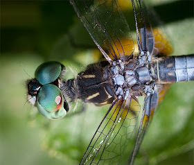 After sleeping the day away while under the weather, I needed a bit of sunlight and fresh air. I didn't go far, just up the road, and came upon this male Blue Dasher, Pachydiplax longipennis, a skimmer of the Libellulidae family. Such marvelous complexity and beauty in a little package.
